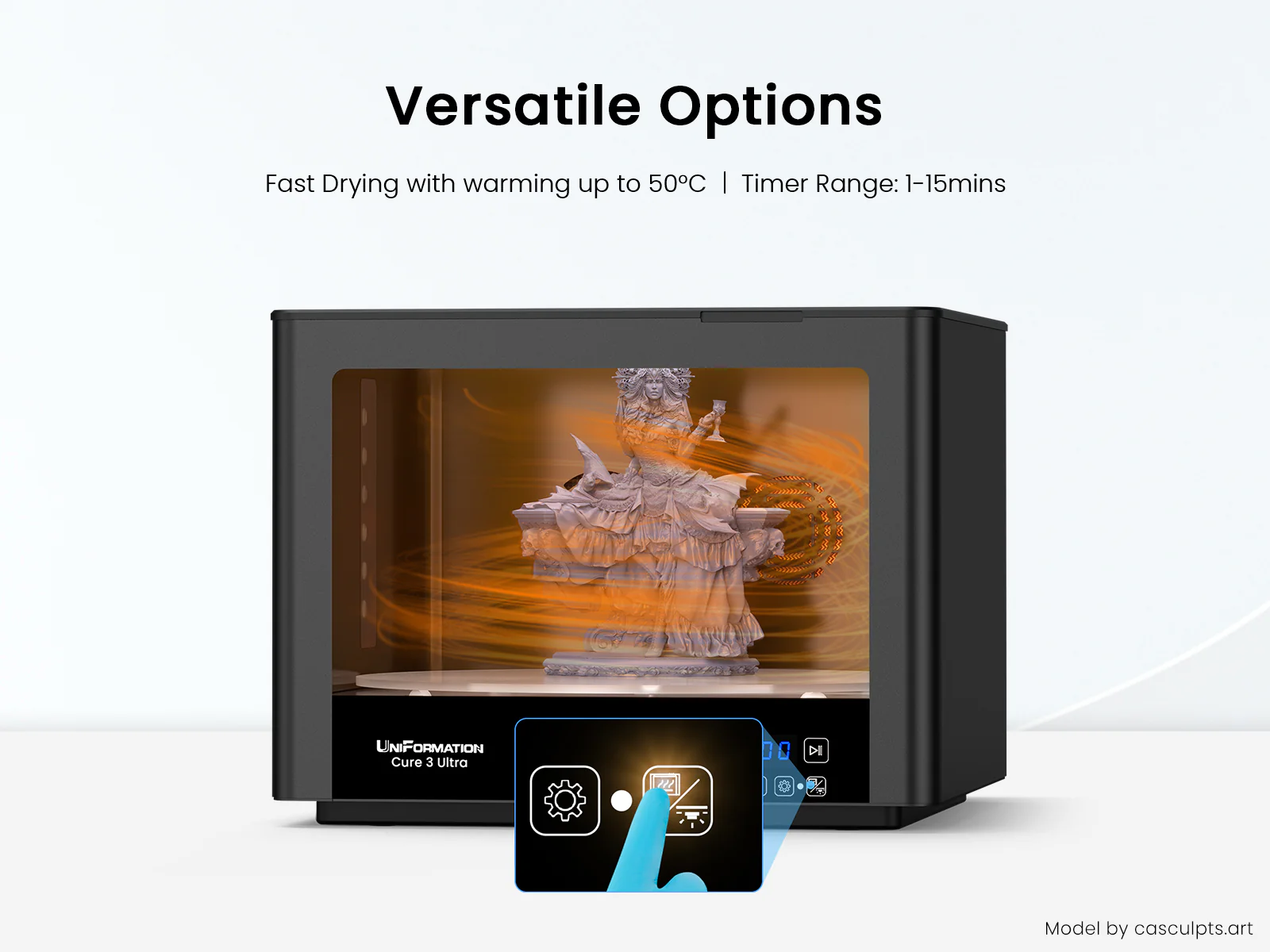 Spacious Curing Volume: Cure 3 Ultra accommodates models up to 362 x 200mm. It can tackle large parts or cure multiple models in a single run simultaneously, which greatly increases efficiency in batches post-curing, perfect for print farms, industrial mass production or bigger printing projects.
